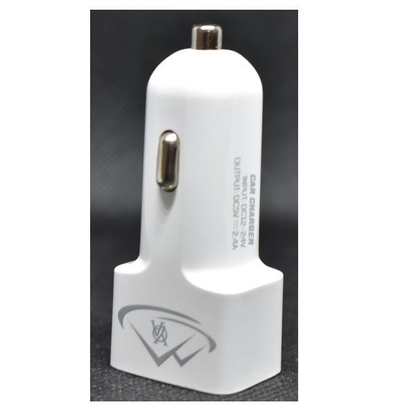 Car chargerUsb port : 2 usb port Input : DC12-24VOut put : 5V/2.4A 1 USB : 5V-2.4A (MAX)Power : 12W Color : white